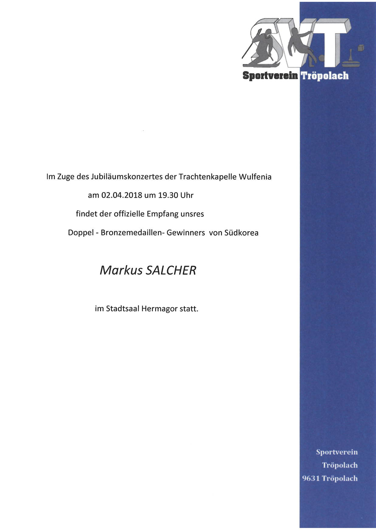Nachdem Markus bei den Paralympics wieder hervorragend abgeschnitten hat, wollen wir ihn am 02.04.2018, im Zuge des Jubiläumskonzerts der Trachtenkapelle Wulfenia, natürlcih gebührend empfangen.