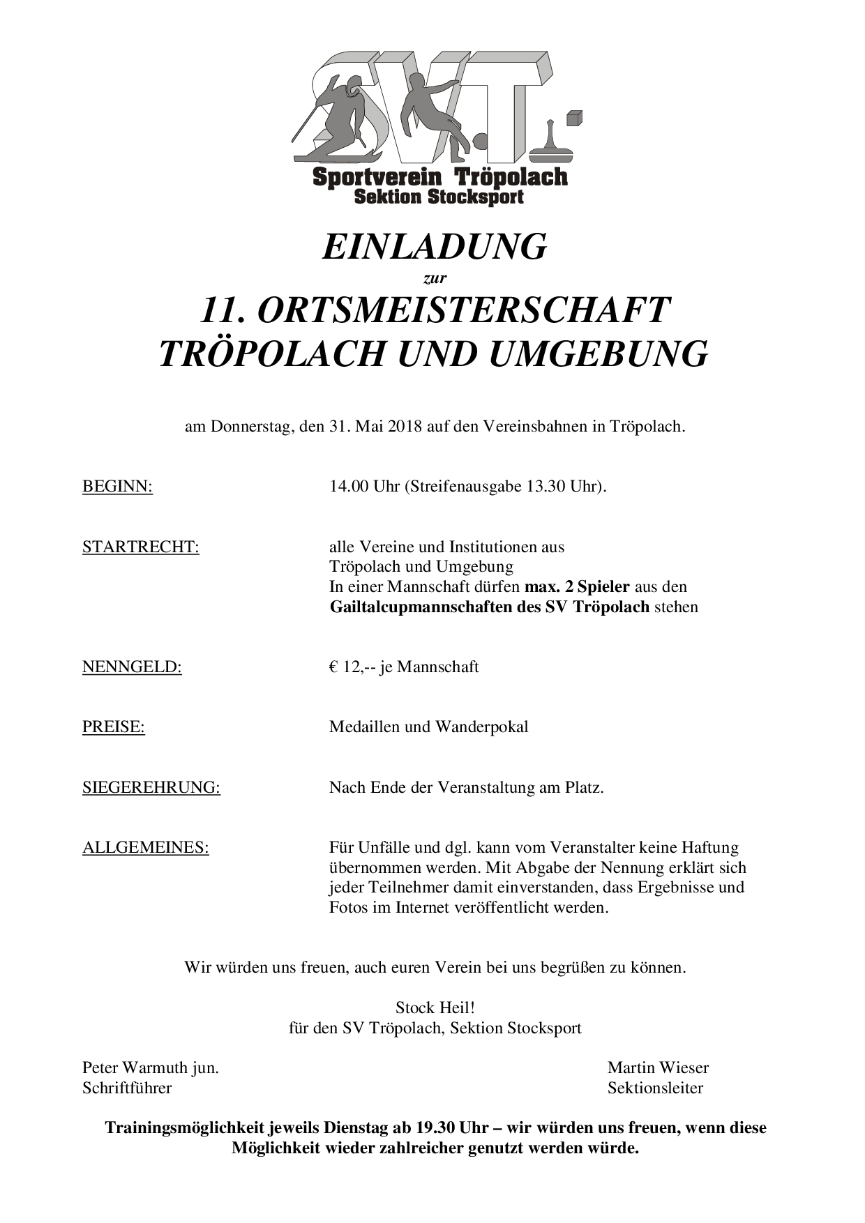 Am 15.06.25 fanden die 18. Ortsmeisterschaften Stocksport für Tröpolach und Umgebung, auf den Vereinsbahnen in Tröpolach, statt. 13 Mannschaften lieferten sich, bei bestem Wetter, spannende Duelle um den begehrten Wanderpokal.Sonntag, 09. März 2025
