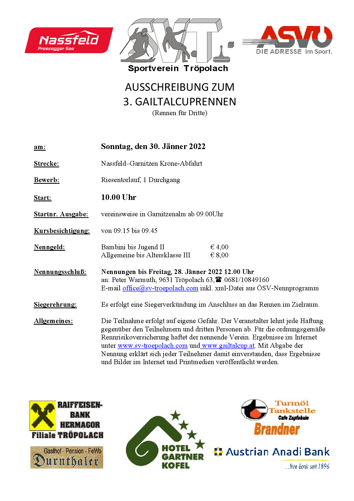 Vereinsmeisterschaft Schi 2025 Am Sonntag, den 09. März fand die Vereinsmeisterschaft Ski Alpin des Sportverein Tröpolach statt. Die selektive Krone-Abfahrt präsentierte sich den 92 Teilnehmern von ihrer besten Seite, wozu neben der Nassfeld Liftgesellschaft von SV Tröpolach Präsident Klaus Herzog, auch der strahlende Sonnenschein seinen Teil dazu beitrug. Zugleich war diese Vereinsmeisterschaft auch der Auftakt zu einem Veranstaltungsreigen anlässlich des 50jährigen Bestandsjubiläum des Vereines.Montag, 03. März 2025