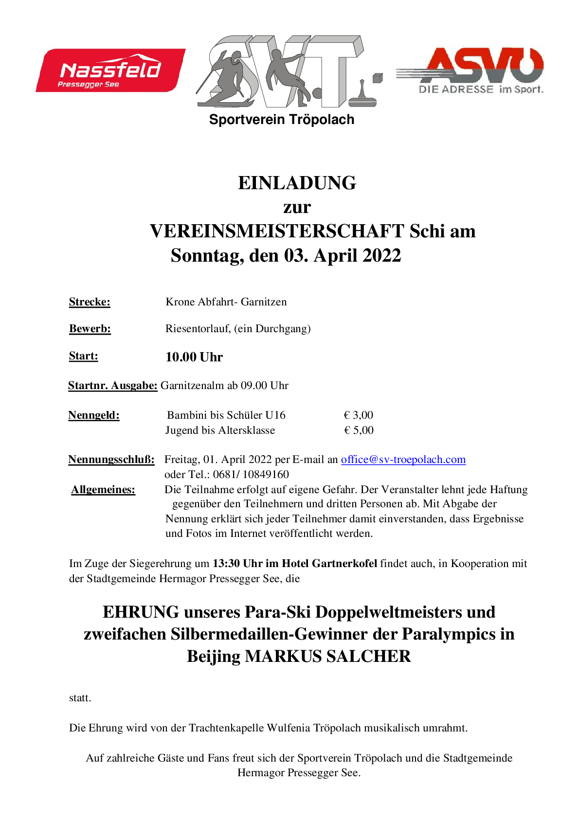 ABGESAGT - VM Schi und Empfang Markus Salcher - ABGESAGT