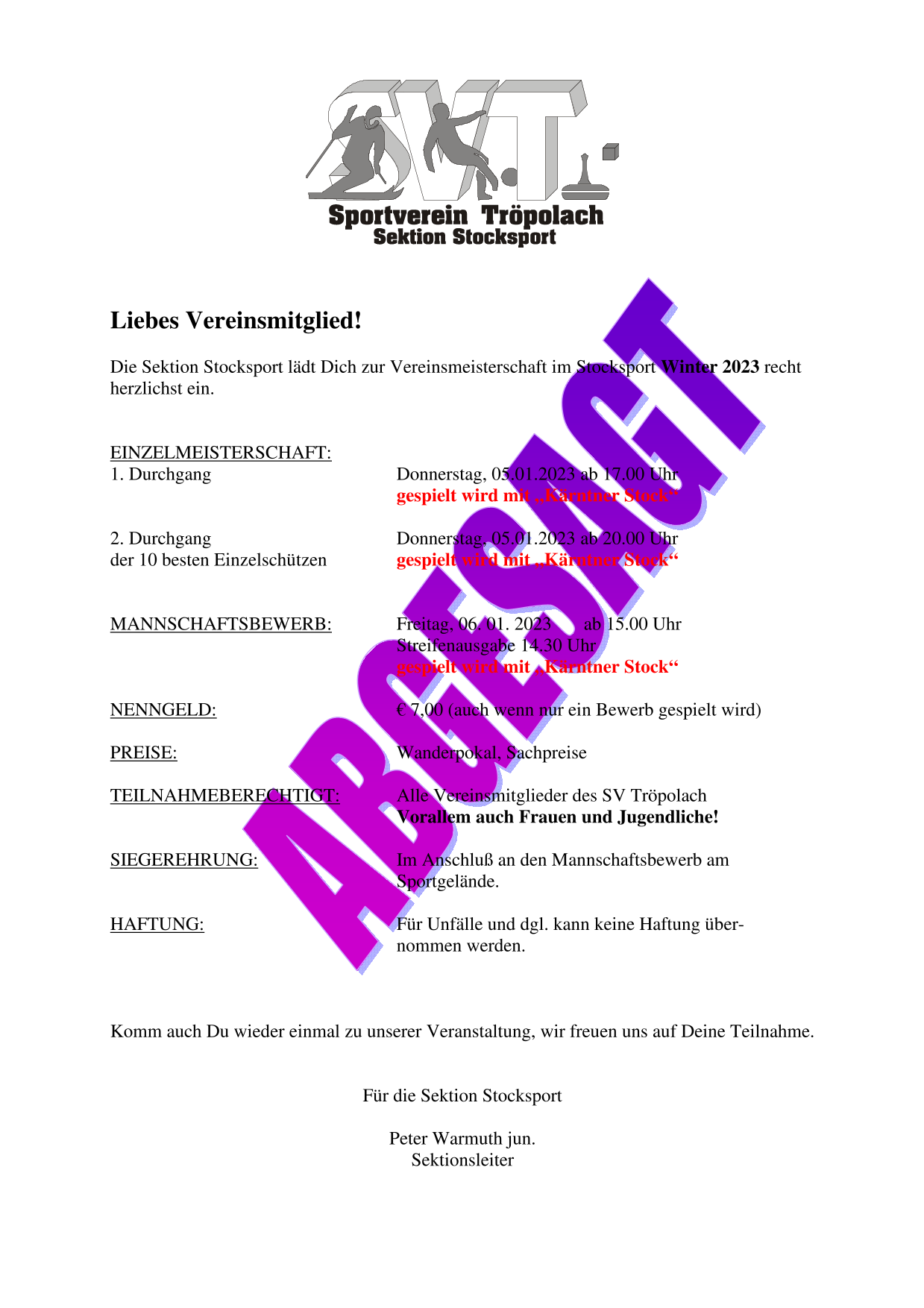 ABGESAGT-Vereinsmeisterschaft Stock Winter 2023 Mannschaft