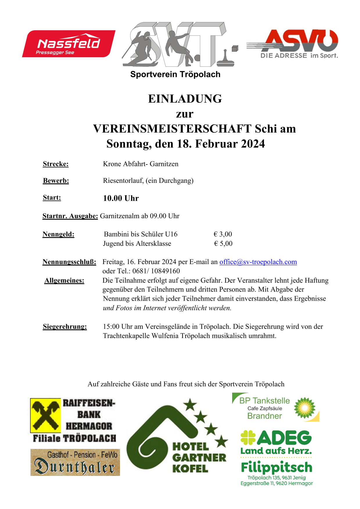 Vereinsmeisterschaft Schi 2025 Am Sonntag, den 09. März fand die Vereinsmeisterschaft Ski Alpin des Sportverein Tröpolach statt. Die selektive Krone-Abfahrt präsentierte sich den 92 Teilnehmern von ihrer besten Seite, wozu neben der Nassfeld Liftgesellschaft von SV Tröpolach Präsident Klaus Herzog, auch der strahlende Sonnenschein seinen Teil dazu beitrug. Zugleich war diese Vereinsmeisterschaft auch der Auftakt zu einem Veranstaltungsreigen anlässlich des 50jährigen Bestandsjubiläum des Vereines.