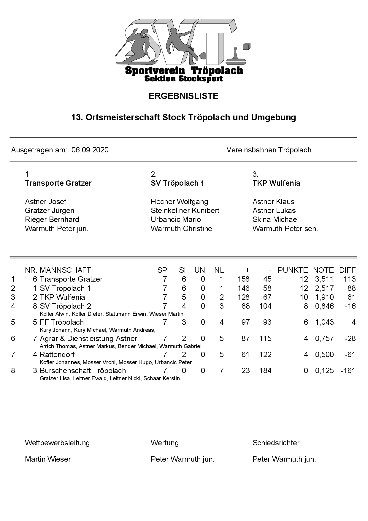 Nachdem uns das Wetter beim ersten Termin noch einen Strich durch die Rechnung gemacht hat, konnte die 13. Ortsmeisterschaft Stocksport, am 06.09.2020 bei besten Bedingungen, auf den Vereinsbahnen in Tröpolach durchgeführt werden.