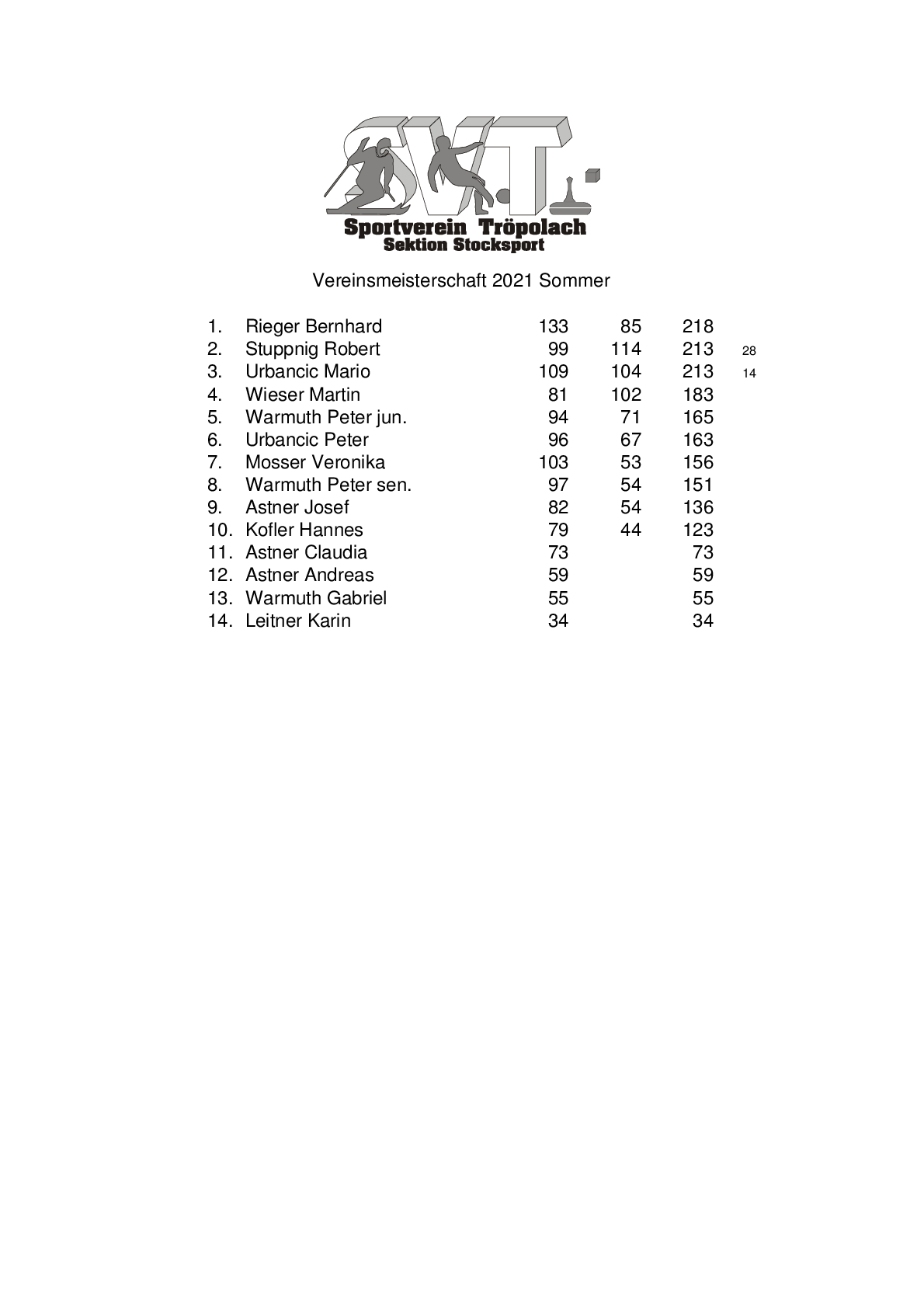 Bei den Damen erreichte Veronika Mosser mit 156 Punkten die höchste Punktezahl, bei den Herren konnte sich Bernhard Rieger mit 218 Punkten knapp vor Robert Stuppnig und Mario Urbancic durchsetzen.