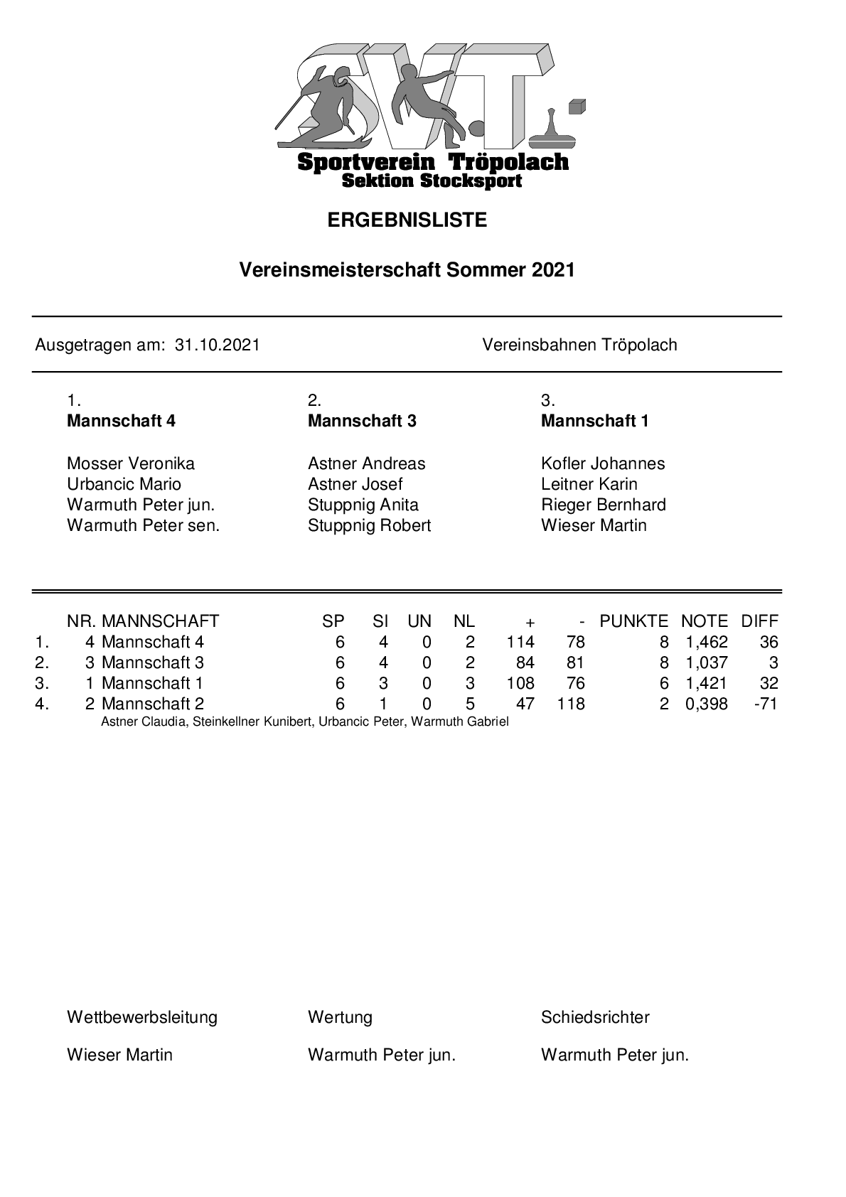 Diesen holte sich, mit 8 Punkten und einer Note von 1,462, die Mannschaft 4 mit Veronika Mosser, Urbancic Mario, Peter Warmuth jun., und Peter Warmuth sen.