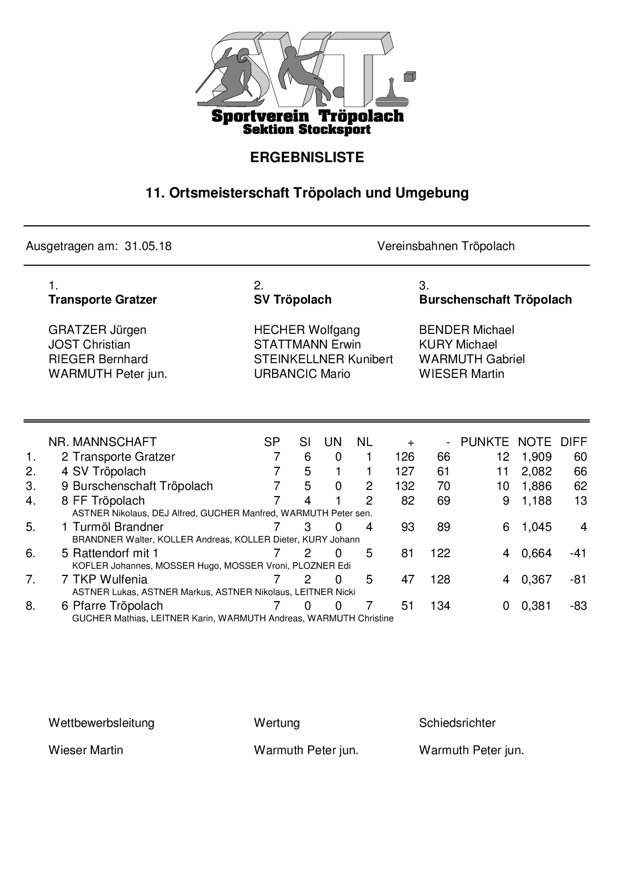 Am 31.05. 2018 fanden die 11. Ortsmeisterschaften Stocksport Tröpolach und Umgebung statt.